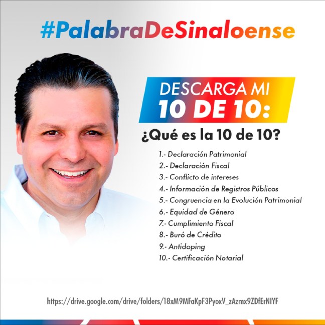 “Antier me entregaron ya el certificado de la fe del notario y hoy a más tardar por la tarde va a estar arriba en mi página mariozamora.mx, todo: la declaración patrimonial, mi declaración fiscal, mi declaración de intereses, mi buró de crédito, antidoping, todo para que vean que yo le pongo hechos a los dichos”, afirmó quien gobernará Sinaloa los próximos 6 años.