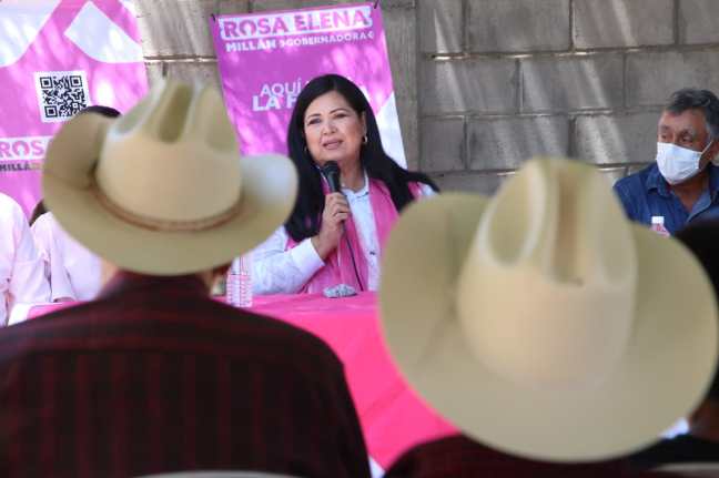 Acompañada del candidato a presidente municipal, Osvaldo Espinoza y el candidato a diputado local por el distrito 6, Vicente Aboyte, expresó que su proyecto ha crecido gracias a que la población ha corrido la voz entre sus vecinos de que la mejor opción para generar un cambio real en la entidad es sin duda Rosa Elena Millán.