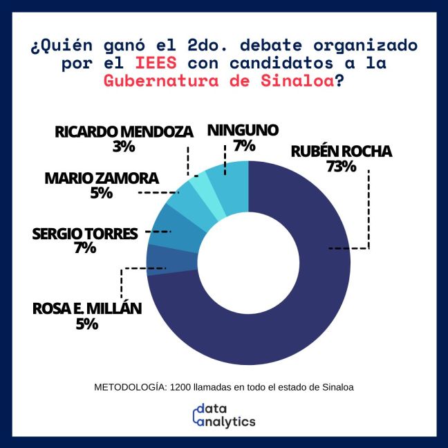 Culiacán, Sinaloa. La percepción ciudadana de que Rubén Rocha Moya ganó en forma contundente y arrolladora el segundo debate entre candidatos organizado por el Instituto Electoral del Estado de Sinaloa (IEES), es confirmada por la encuesta levantada al término del evento por la empresa Data Analytics, que arroja que el 73 por ciento de los entrevistados vieron ganar al abanderado de la alianza Morena-PAS, contra el 7 por ciento de su más cercano contendiente.