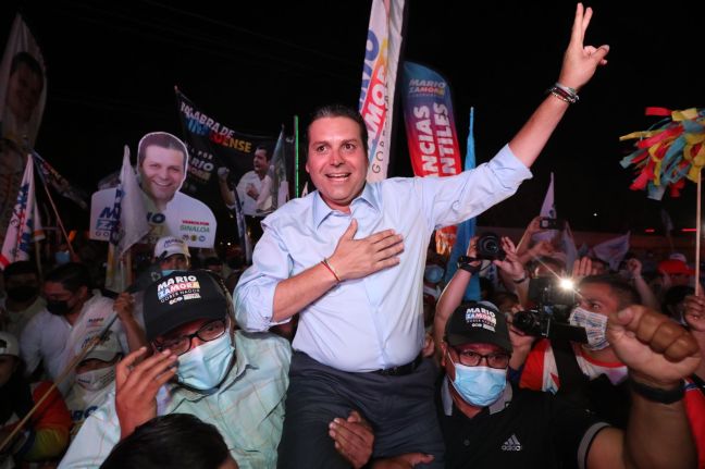Los suyos gritan y aplauden. Lo siguen en su camino al camión de la victoria. Se oyen los gritos: ¡Mario gobernador, Mario gobernador, Mario gobernador!
