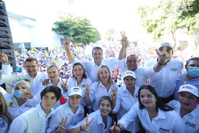 El próximo gobernador está frente a los suyos y con los suyos, su esposa Wendy, sus hijas, su familia, dirigentes de los partidos políticos que lo abanderan, líderes sociales, las y los ahomenses, todos están aquí. Está en su tierra. Y son tantos y tantas los que han venido desde diferentes comunidades y colonias populares.