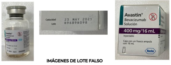 · Avastin (bevacizumab), también fue falsificado en su presentación de 400 miligramos (mg)/16 mililitros (ml). Presenta inconsistencias en los empaques, ya que en el frasco ostenta el número de lote B96896, el cual es diferente al presentado en la caja: B9689B098.