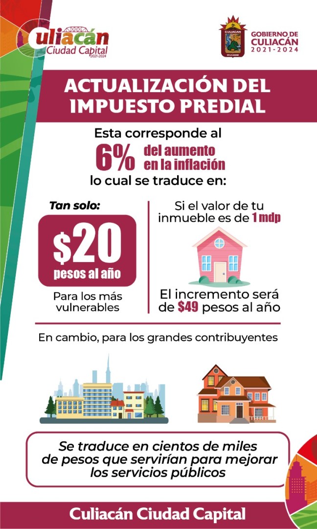 Pues cabe resaltar que la actualización del Impuesto Predial propuesta por el alcalde de Culiacán, se basa en el 6% del aumento en la inflación, es decir, $20 pesos al año para los ciudadanos más vulnerables, y solo 49 pesos al año para quienes tienen un inmueble de 1 millón de pesos.