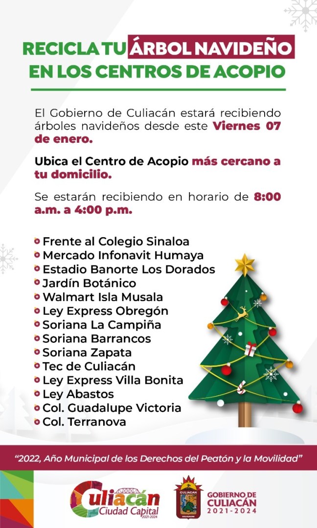 Culiacán, Sin. El Gobierno de Culiacán a través de la Dirección de Servicios Públicos, llevará a cabo la instalación de 14 centros de acopio para dar inicio a los trabajos de recolección de pinos y arbolitos navideños, esto con el propósito de evitar accidentes en los hogares y espacios públicos derivados de su quema indebida.