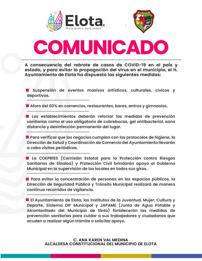 – El Ayuntamiento de Elota, los Institutos de la Juventud, Mujer, Cultura y Deporte, Sistema DIF Municipal y JAPAME (Junta de Agua Potable y Alcantarillado del Municipio de Elota) fortalecerán las medidas de prevención sanitarias para cuidar a sus trabajadores y ciudadanos que acuden a realizar algún trámite o solicitar apoyo.