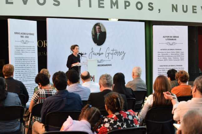 Martha Tamayo Morales, en su mensaje, destacó el legado de “uno de los nuestros”, como mencionó al maestro Sergio Jacobo Gutiérrez, un hombre extraordinario, que calificaba sobradamente con el perfil requerido: “era una personaje serio, comprometido y formal, dispuesto siempre a sumarse, honesto y confiable”.