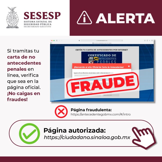 Culiacán, Sin. El área de Cartas de No Antecedentes Penales que depende del Secretariado Ejecutivo del Sistema Estatal de Seguridad Pública (SESESP) detectó la circulación de una página web fraudulenta para este trámite.