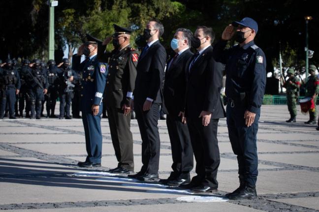 - En el marco del 216 aniversario del natalicio del Benemérito de las Américas, Don Benito Juárez, autoridades civiles y políticas conmemoraron este día a uno de los personajes más importantes para la historia de México con un izamiento de bandera a toda asta con Honores de Ordenanza en la plaza cívica de Palacio de Gobierno.