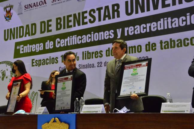 De esta manera, se realizó la entrega de 45 Certificaciones y Reacreditaciones de los Espacios 100% libres de humo de tabaco, en virtud de cumplir satisfactoriamente con los lineamientos estipulados en la Ley General para el Control del Tabaco a favor de la salud de todos sus trabajadores y visitantes de la Universidad Autónoma de Sinaloa.