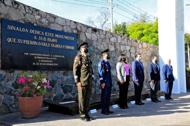 - Tras rendir los honores a la bandera, las autoridades presentes se desplazaron a la Rotonda de los Sinaloenses Ilustres, ubicada sobre el Boulevard Leyva Solano, frente al Panteón Civil, donde se realizó una guardia de honor con un minuto de silencio.
