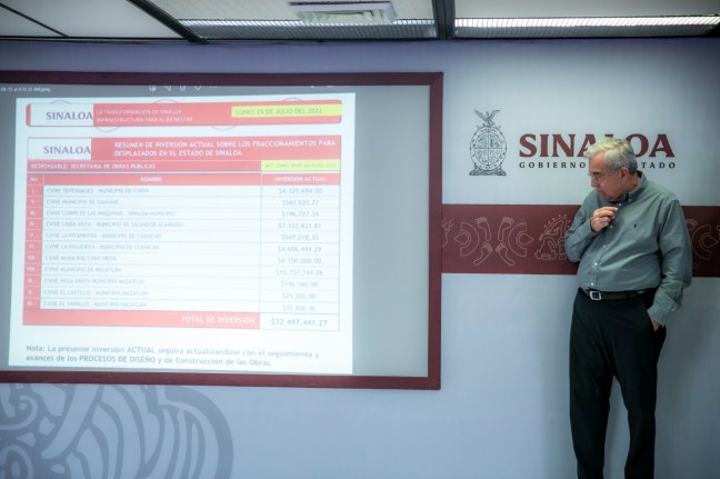 Enrique Inzunza Cázarez, Secretario General de Gobierno, detalló las inversiones realizadas en cada uno de los fraccionamientos para desplazados, con corte al día 25 de julio del presente año, señalando que hasta el momento, el monto total de inversión realizada asciende a 32 millones, 497 mil 441 pesos, distribuidos entre los once proyectos que existen a nivel estatal.