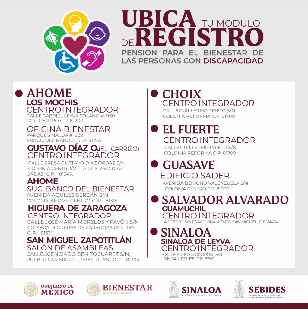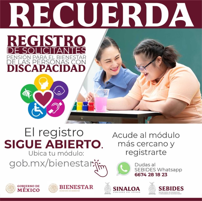 “Ya tenemos aquí nosotros un avance en Sinaloa de 26 mil personas registradas… el registro nos dijeron que cerraba el 30 de noviembre… quiero decirles que la pensión es bimestral, será de 2 mil 800 pesos para cada uno de los beneficiarios, tiene que ser discapacidad permanente, tiene que verlo un experto, un médico para esto y se está trabajando de la mano de la federación completamente”, comentó.