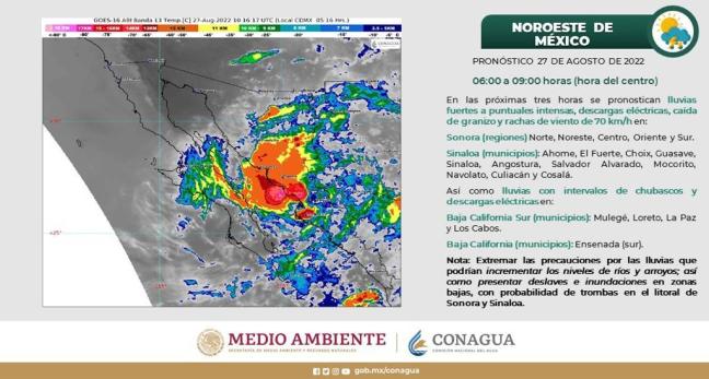 En base al reporte regional de Conagua, se esperan lluvias puntuales intensas en Sinaloa, con posibles descargas eléctricas, por lo que se pide a la ciudadanía estar atentos al desarrollo de las precipitaciones e incrementar sus precauciones.