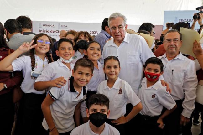 Culiacán, Sinaloa. Ante niños y niñas de la Escuela Primaria Primaria «Rafael Ramírez», ubicada en el sector Humaya, el Gobernador Rubén Rocha Moya inauguró formalmente el ciclo escolar 2022-2023, acompañado de Graciela Domínguez Nava, Secretaria de Educación Pública y Cultura, Juan de Dios Gámez, Alcalde de Culiacán, además de autoridades federales y líderes sindicales magisteriales.