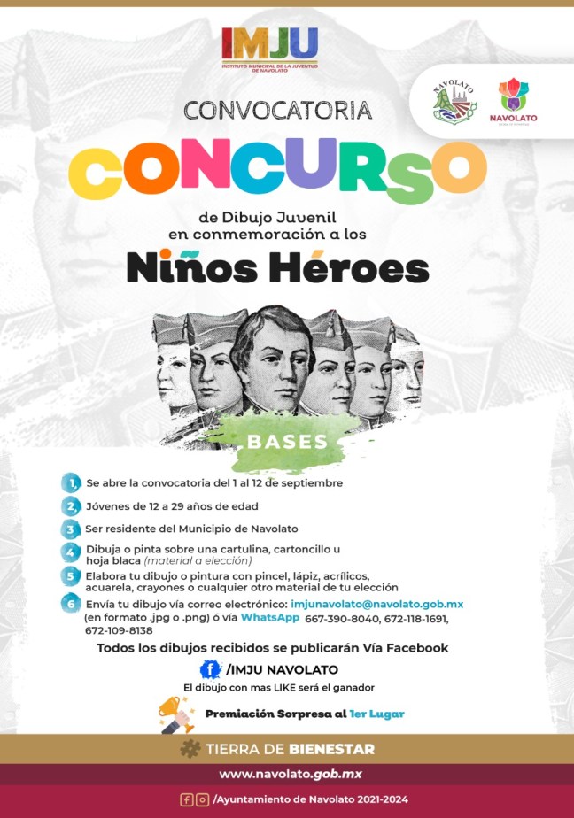 Todos los dibujos recibidos se publicarán vía facebook en la página “Imju Navolato”, y el ganador será quien tenga más Like y Me encanta hasta el día 16 de septiembre a las 15:00 horas. El día 17 de septiembre se anunciará el ganador del primer lugar, para quien habrá un regalo sorpresa. Todos los anuncios serán a través de las redes sociales del Instituto Municipal de la Juventud.