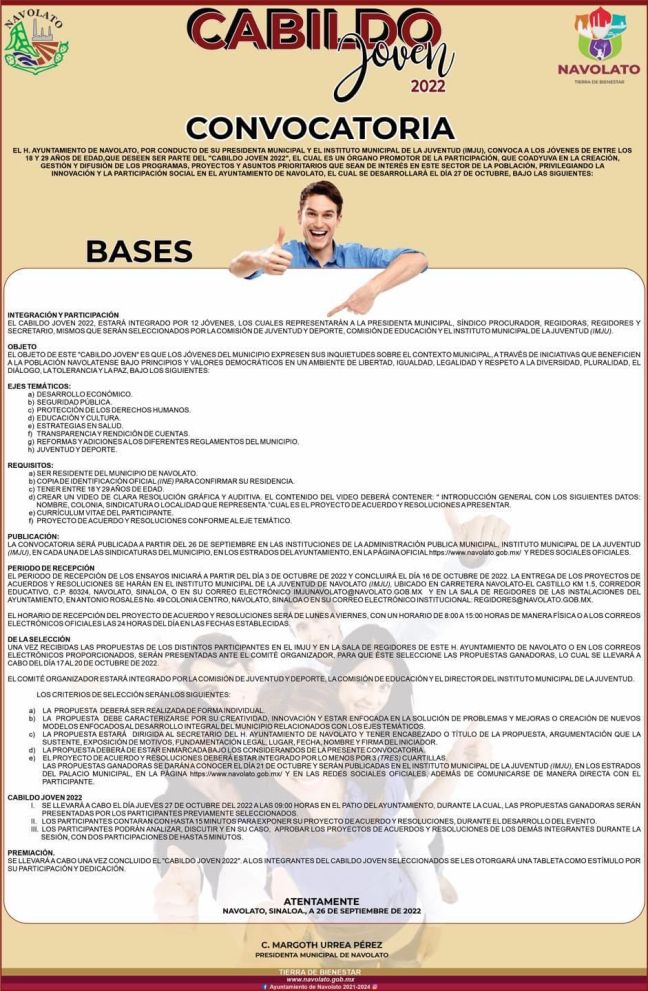 Navolato, Sinaloa. El H. Ayuntamiento de Navolato y el Instituto Municipal de la Juventud (IMJU), convocan a los jóvenes navolatenses de entre los 18 y 29 años de edad, interesados en formar parte de “Cabildo Joven 2022”, a participar en dicha sesión el día jueves 27 de octubre a las 9:00 horas en el patio del Ayuntamiento.