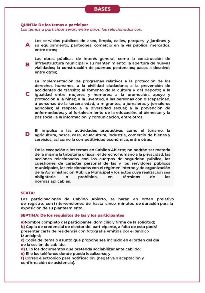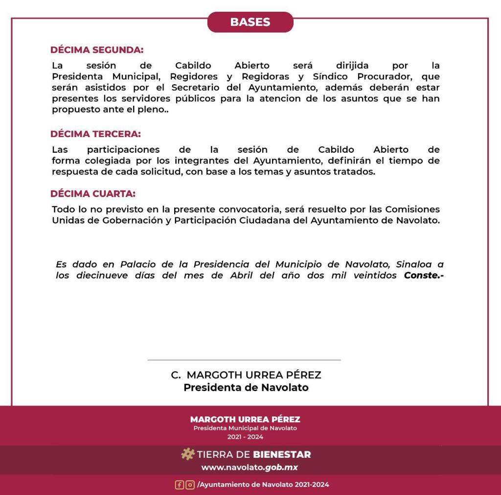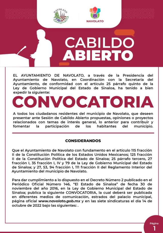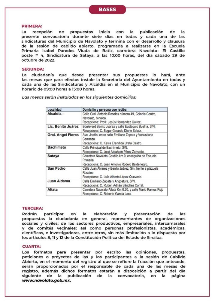 Navolato, Sinaloa. El H. Ayuntamiento de Navolato en coordinación con la Secretaría del Ayuntamiento, convoca a todos los ciudadanos residentes del municipio de Navolato, que deseen presentar ante sesión de Cabildo Abierto propuestas, opiniones o proyectos relacionados con temas de interés general, lo anterior para contribuir y fomentar la participación de los habitantes del municipio.