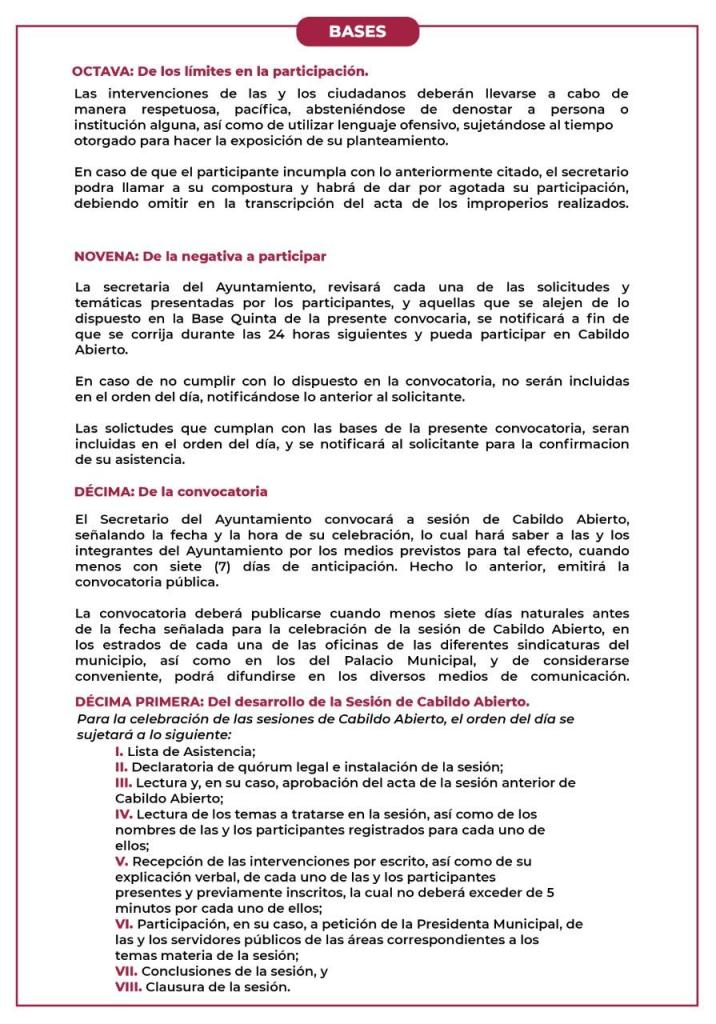 “Los invitamos a todos los navolatenses a que participen en esta edición de Cabildo Abierto que se realizará en la sindicatura de Sataya. La ciudadanía que desee presentar sus propuestas lo puede hacer en las mesas receptoras ubicadas en la Alcaldía Central y las siete sindicaturas del municipio. Los invito a ejercer su derecho a la participación ciudadana, a expresar su opinión y ser escuchados”.