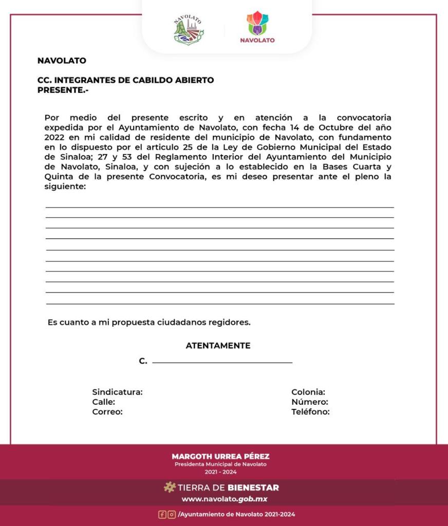 Los formatos para presentar por escrito las opiniones, propuestas, peticiones o proyectos de las y los participantes a la sesión de Cabildo Abierto, en el momento del registro, serán proporcionados por el responsable de cada una de las mesas de registro, además dicho formato se puede encontrar en la página http://www.navolato.gob.mxy por redes sociales oficiales.