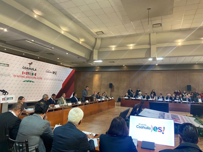 Saltillo, Coahuila. Al iniciar los trabajos de la reunión “Acuerdo Agropecuario Tri Nacional” México-EU-Canadá en Coahuila, el titular de la SADER, Víctor Villalobos Arámbula y el Secretario de Agricultura y Ganadería de Sinaloa y Presidente de la AMSDA, Ing. José Jaime Montes Salas coincidieron en la necesidad de trabajar para dar a nuestros países y al mundo alimentos sanos, inocuos y accesibles.