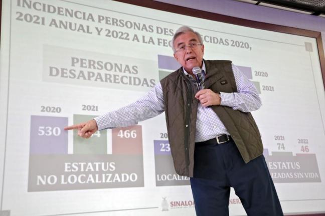 Culiacán, Sinaloa. El gobernador Rubén Rocha Moya dio a conocer que su primer año de gobierno registra mejores resultados en materia de seguridad en comparación con el primer año de sus antecesores Mario López Valdez (2011) y Quirino Ordaz Coppel (2017), pues de acuerdo con cifras oficiales de la Fiscalía General del Estado, en este 2022 se registraron considerablemente menos homicidios dolosos, feminicidios y desapariciones forzadas, que son los delitos de más alto impacto social.