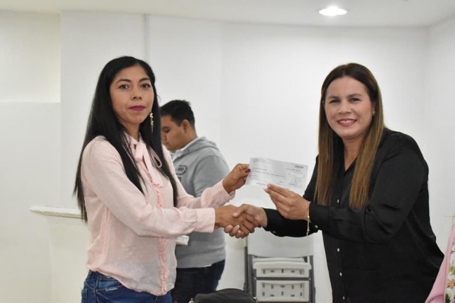 El secretario del Ayuntamiento, Omar Ayala Terraza, y la directora de Desarrollo Social, Verónica Padilla Peraza, otorgaron de manera simbólica los cheques del Programa Mujeres Ahorradoras.