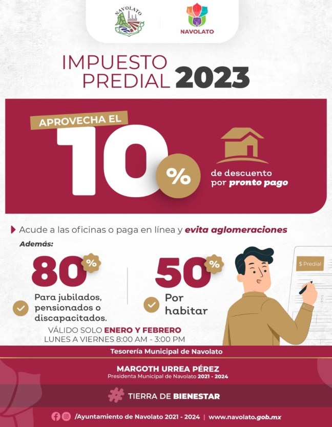 – Con la finalidad de contribuir a la economía de las familias navolatenses, la Presidenta Municipal de Navolato, Margoth Urrea Pérez, informó que ha instruido al área de Tesorería Municipal implementar una campaña de descuentos en el impuesto predial del año 2023.La Alcaldesa Margoth Urrea Pérez invitó a los contribuyentes a aprovechar los descuentos y realizar sus pagos correspondientes, con descuentos desde el 10% hasta el 80% durante los meses de enero y febrero.“Quiero invitar a las y los navolatenses a aprovechar los siguientes descuentos del impuesto predial para el año 2023: del 10% de descuento por pronto pago, del 50% de descuento por habitar, y del 80% de descuento para jubilados, pensionados y discapacitados. La finalidad es apoyar a los ciudadanos en la economía familiar, es por ello que les reitero que paguen a tiempo el impuesto predial del año 2023, los descuentos se aplicarán solo en los meses de enero y febrero. Pueden pagar en oficinas o en línea para evitar aglomeraciones”.Para facilitarles sus pagos a las personas de fuera se instalaron cajas de cobro en las sindicaturas más grandes del municipio: Villa Ángel Flores “La Palma”, San Pedro y Lic. Benito Juárez, mismas que atienden al contribuyente de lunes a viernes en un horario de 8:00 A.M. a 2:30 P.M.”.En la Alcaldía Central los pagos pueden realizarse en efectivo o con tarjeta en ventanilla de pagos, ubicada en el Palacio Municipal, la cual se encuentra del lado izquierdo al ingresar al edificio en un horario de 8:00 A.M. a 3:00 P.M. o realizar el pago en línea.
