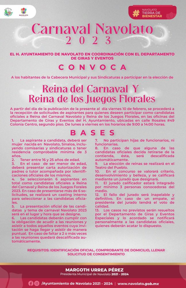 Navolato, Sinaloa, a jueves 09 de febrero de 2023.**- El H. Ayuntamiento de Navolato que preside la Alcaldesa Margoth Urrea Pérez en coordinación con el Departamento de Giras y Eventos, convoca a las y los habitantes de la cabecera municipal y sus sindicaturas a participar en la elección de Reina del Carnaval, Reina de los Juegos Florales, Reina Infantil del Carnaval, Reina Infantil de los Juegos Florales, Rey del Carnaval y Reina Gay.