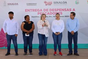 Margoth Urrea Pérez y Eneyda Rocha Ruiz entregan despensas a pescadores de Dautillos