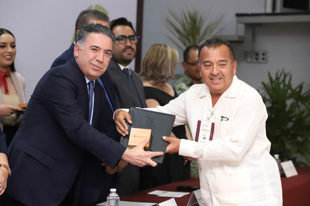 “Junto a las escuelas públicas siempre ha estado el SNTE, quienes lo integramos somos trabajadores, maestros sindicalistas y ciudadanos que reconocemos en el señor gobernador, el doctor Rubén Rocha Moya a un líder que nos entiende, que ha hecho suyas nuestras reivindicaciones, que nos ha escuchado, agradecerle por atender y dar respuesta a nuestros planteamientos y propuestas para mejorar la calidad de vida de los trabajadores de la educación”, agradeció.
