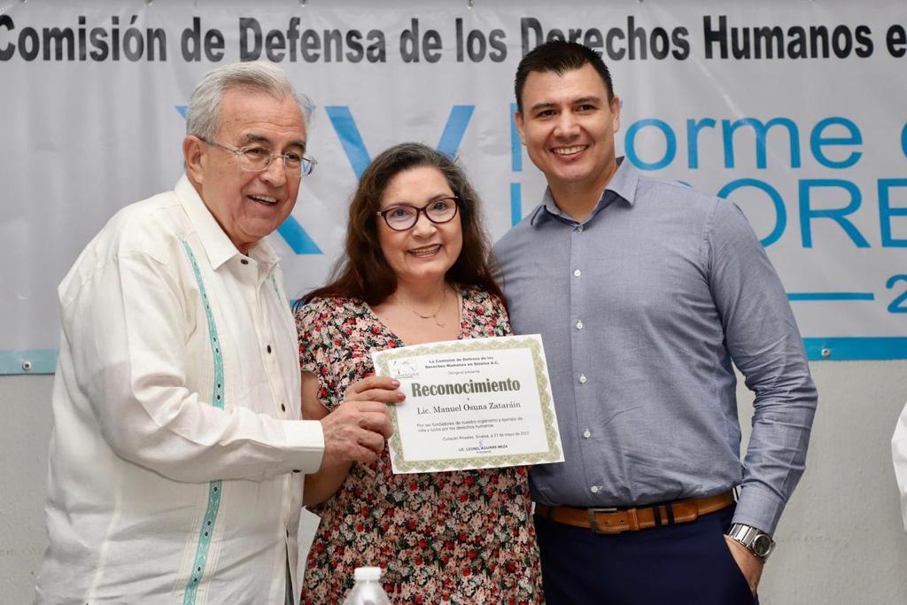 El Gobernador Rubén Rocha también hizo entrega de reconocimientos para los fundadores de la Comisión de Defensa de los Derechos Humanos David Moreno Lizárraga y Óscar Loza Ochoa y a los familiares de Carlos Morán Cortés, Manuel Osuna Zatarain por el trabajo que estos realizaron en vida dentro de la Comisión.