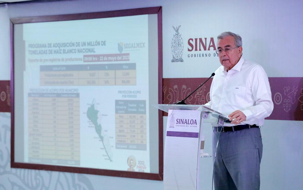 Culiacán, Sinaloa, a mayo de 2023.- El esquema acordado para la comercialización del maíz, que consiste en la compra por parte de Segalmex de un millón 500 mil toneladas a pequeños productores desde 10 hasta 20 hectáreas, y en el caso de los productores de 10 hectáreas ya se tiene un avance del 72 por ciento, pues se tienen registrados un total de 9 mil 627 productores, con una cosecha estimada en más de 562 mil toneladas, informó el gobernador Rubén Rocha Moya.