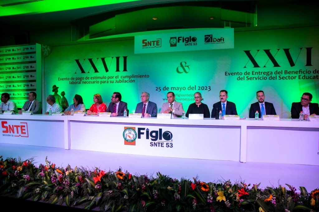 El mandatario estatal acudió al Salón 53 para encabezar esta ceremonia de la XXVII Entrega de estímulos por cumplimiento laboral para jubilación, y la XXVI Entrega del beneficio de retiro del servicio del sector educativo, recursos que entregó en compañía del secretario general de la Sección 53 de SNTE, Ricardo Madrid Uriarte; de la secretaria de Educación Pública y Cultura, Graciela Domínguez Nava; y del director del ISSSTESIN, Daniel Ramírez León, entre otras autoridades educativas.