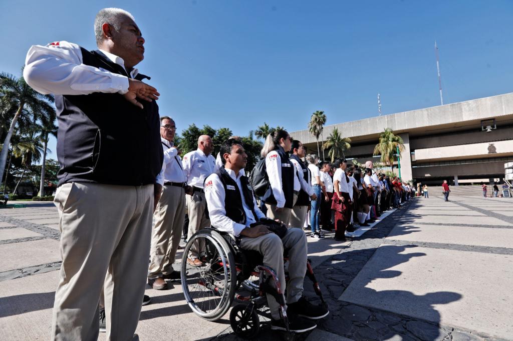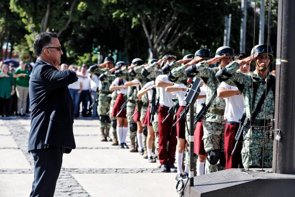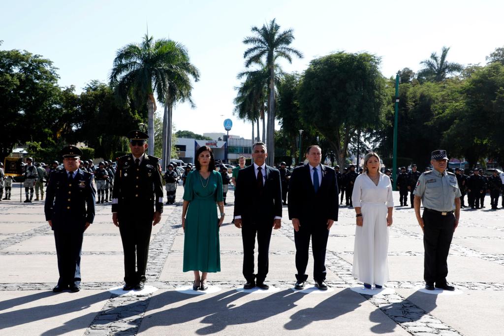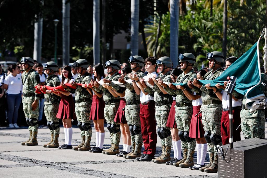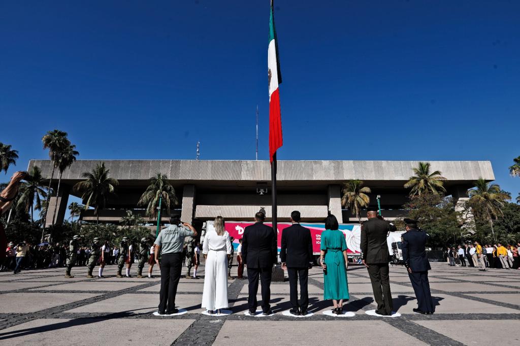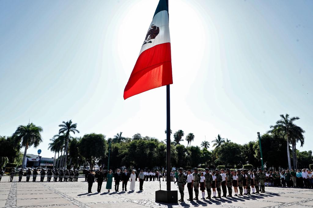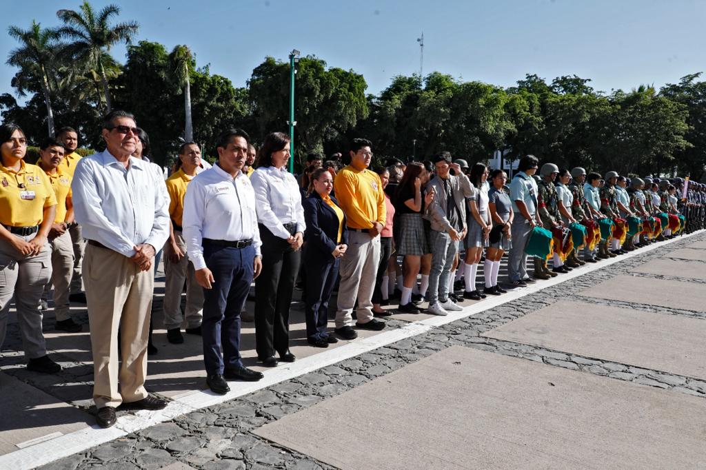 En representación del gobernador Rubén Rocha Moya, el director General de Conalep Wilfredo Véliz Figueroa encabezó este acto de fomento hacia los símbolos patrios, acompañado por la representante del H. Congreso del Estado de Sinaloa y diputada Giovanna Morachis Paperini, el presidente del Supremo Tribunal de Justicia Jesús Iván Chávez Rangel, el comandante del 9/o Batallón de la Guardia Nacional Omar Alberto Cabello Zarazúa y el representante de la base Áerea Militar No. 10 Sergio Núñez Pérez.
