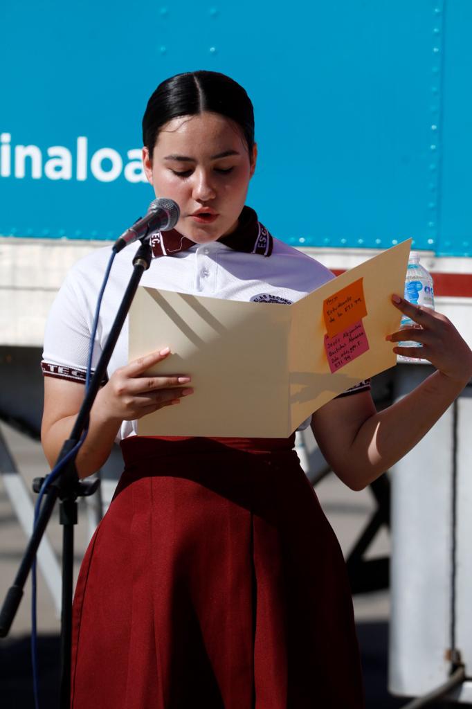 Tras terminar los Honores a los símbolos patrios, la alumna Jesús Alejandra Bastidas Almanza de 2do grado de la Escuela Técnica Industrial No. 79, dio lectura a las efemérides del mes de junio además de una pequeña semblanza de Don Francisco Villa.