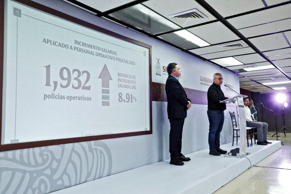 Culiacán, Sinaloa, junio de 2023.- El secretario de Seguridad Pública Cristóbal Castañeda Camarillo informó en la conferencia “La Semanera” que, como un hecho de justicia social, el gobernador Rubén Rocha Moya tuvo a bien implementar un segundo incremento del 8.91 por ciento al sueldo de los policías estatales, Custodios Penitenciarios y de Servicios de Protección.