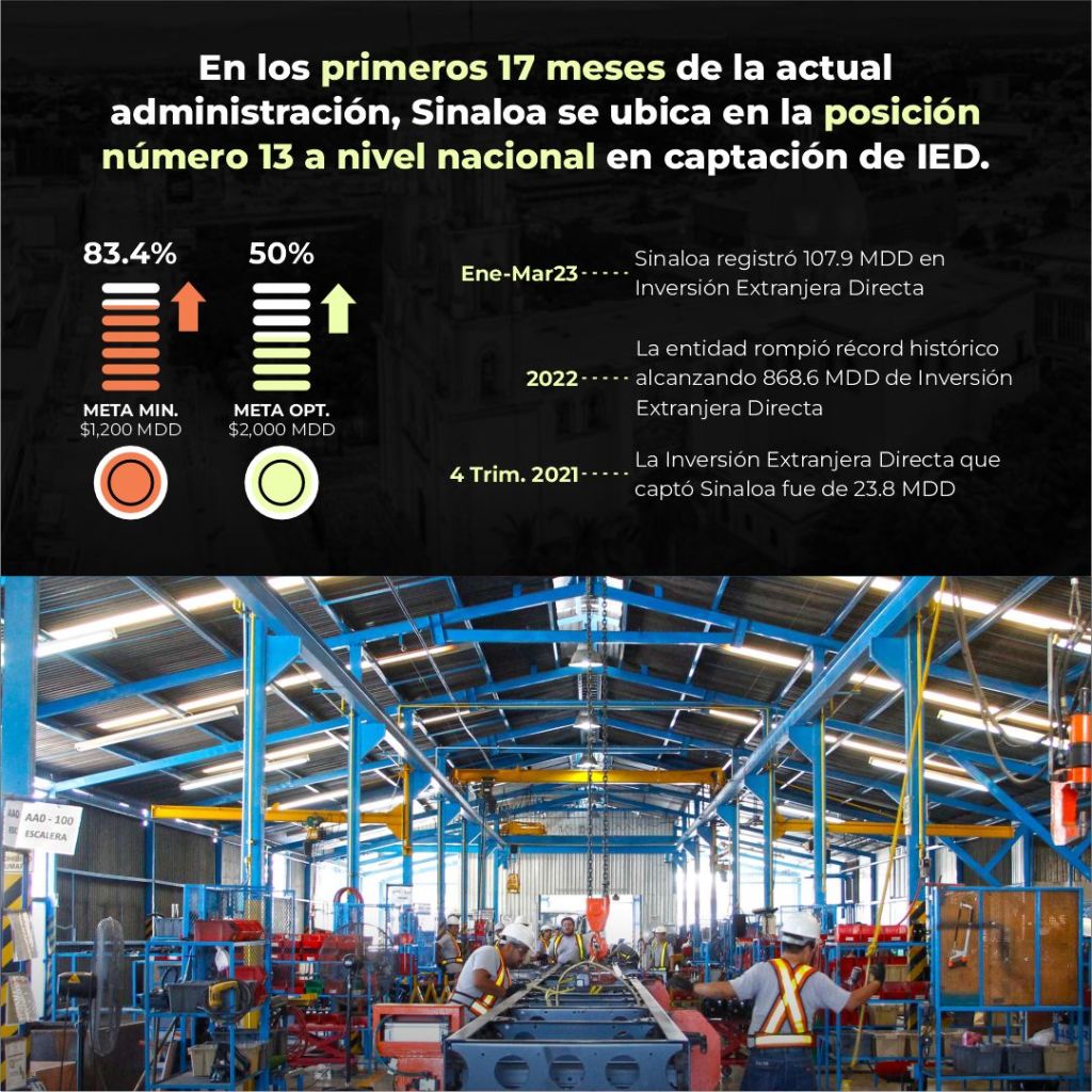 De acuerdo con el informe trimestral que presentó la Secretaría de Economía del Gobierno Federal, Sinaloa registró $107.9 millones de dólares en Inversión Extranjera Directa de enero a marzo de 2023.