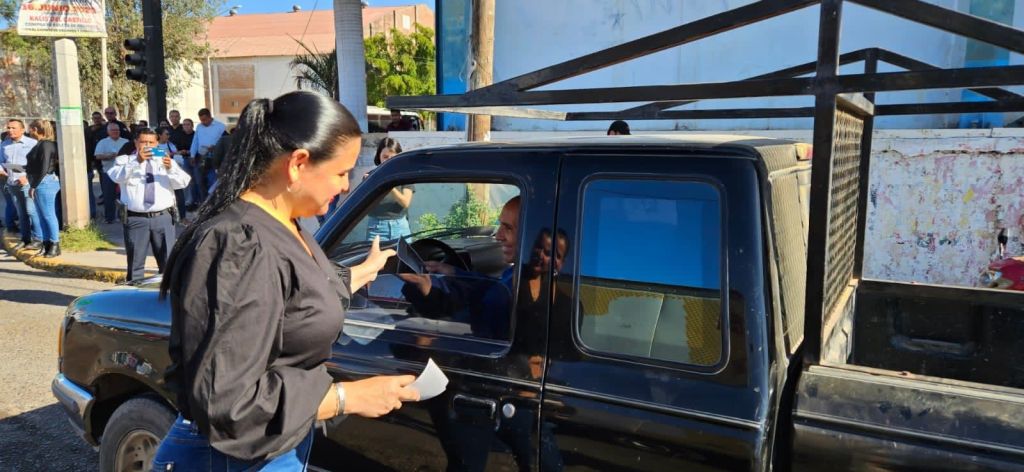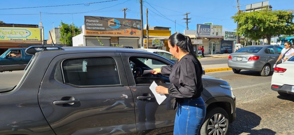 Navolato, Sinaloa, a junio de 2023.- La Presidenta Municipal de Navolato, Margoth Urrea Pérez, encabezó este lunes por la mañana la entrega de volantes en el crucero del Ingenio, con la finalidad de concientizar a los ciudadanos sobre evitar darle trabajo a niñas y niños, o mandar a trabajar a sus hijas e hijos menores de edad.