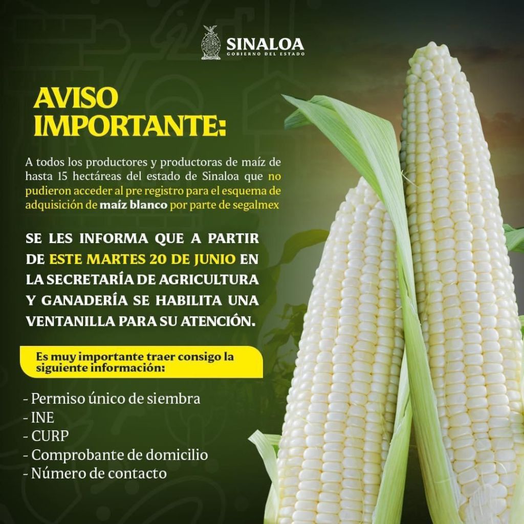 Dichas acciones tienen el propósito de cumplir cabalmente el objetivo establecido por el Gobernador del Estado, Rubén Rocha Moya para comprar la cosecha de maíz a los productores de todo el estado con menos de 15 hectáreas.