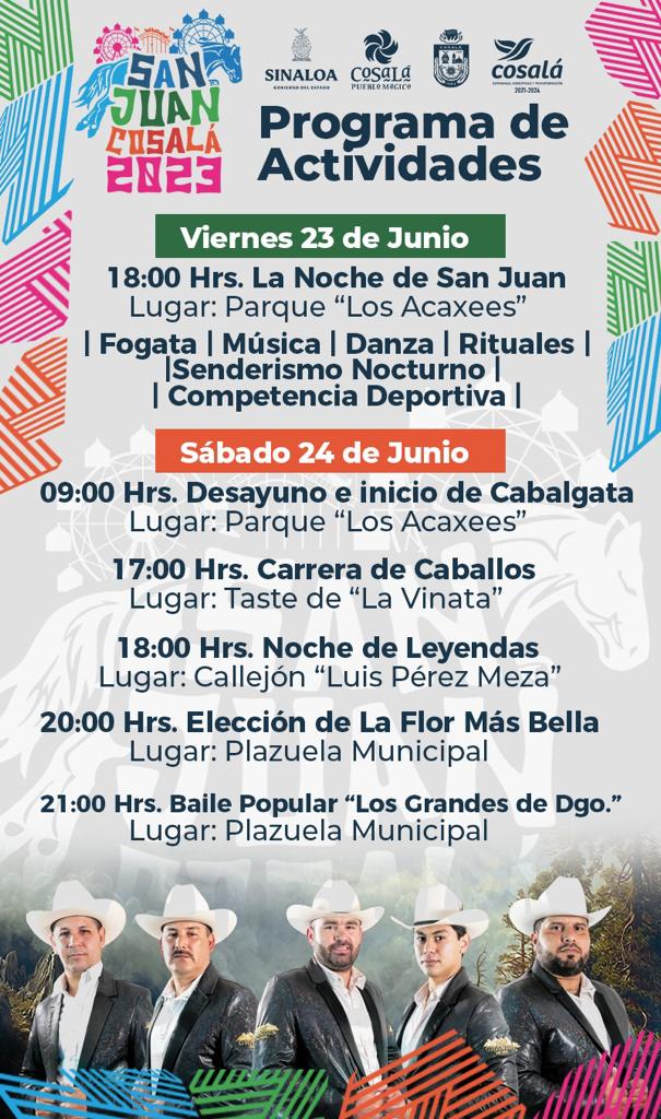 Culiacán, Sinaloa, junio del 2023.- Como parte de la tradición del municipio de Cosalá, se celebrará en este municipio el día de San Juan Bautista, con un extenso programa de actividades artísticas y culturales para conmemorar esta costumbre milenaria que busca decir adiós a todos los malos recuerdos, ahuyentar a los malos espíritus y atraer la buena suerte para todas y todos.