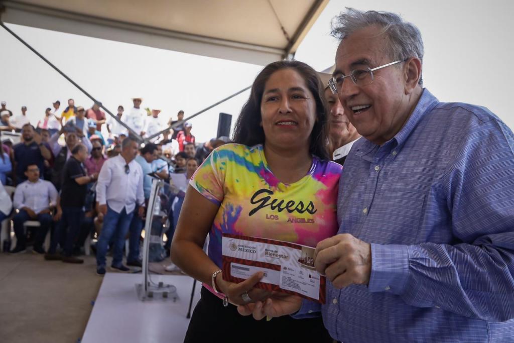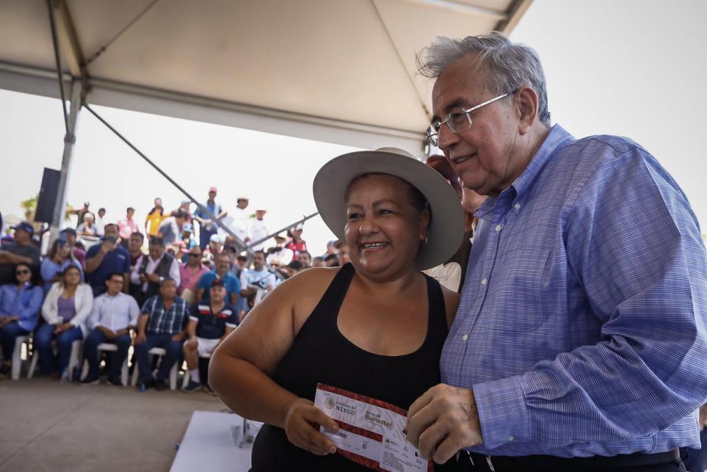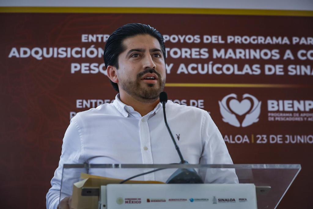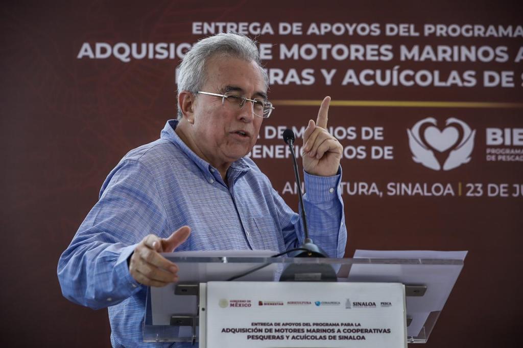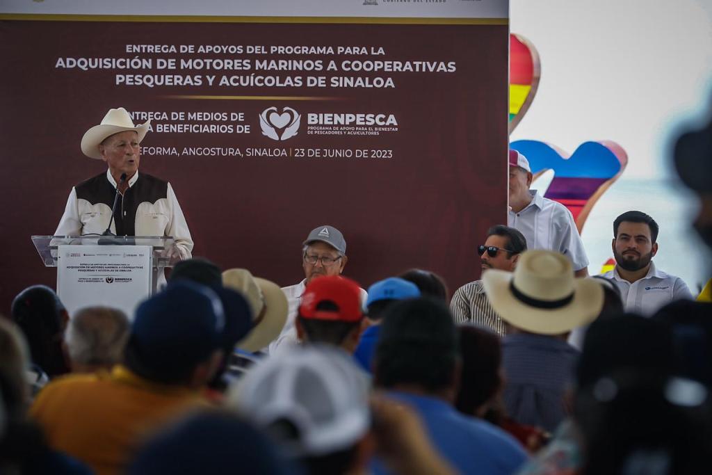 Acompañado por la secretaria de Pesca y Acuacultura, Flor Emilia Guerra Mena; y el por delegado de los Programas del Bienestar en Sinaloa, Omar Alejandro López Campos, el mandatario estatal fue recibido en este campo pesquero por el presidente municipal de Angostura, Miguel Ángel Angulo Acosta y cientos de familias de pescadores, quienes recibieron tanto los motores marinos como sus tarjetas del Bienestar, donde se les depositará en julio su apoyo de 11 mil 250 pesos, que consiste en 7 mil 500 pesos del Bienpesca federal más otro complemento de 3 mil 750 pesos del llamado Bienpesca estatal.