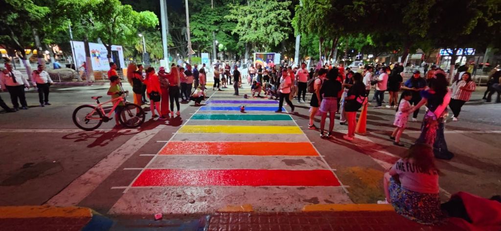 Al final pintaron el cruce peatonal frente al Ayuntamiento de Navolato con los colores de la bandera de la diversidad sexual y de género, como muestra de un gobierno incluyente.
