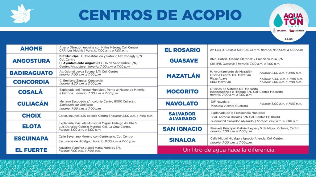 Durante el AQUATÓN 2022, se lograron acopiar en todo Sinaloa más de 500 mil litros de agua, y en esta ocasión, con la solidaridad que distingue a los sinaloenses, se espera superar esa cifra.