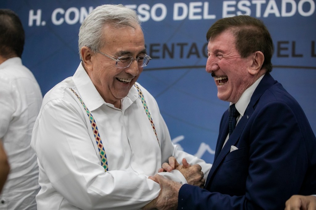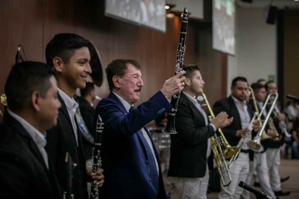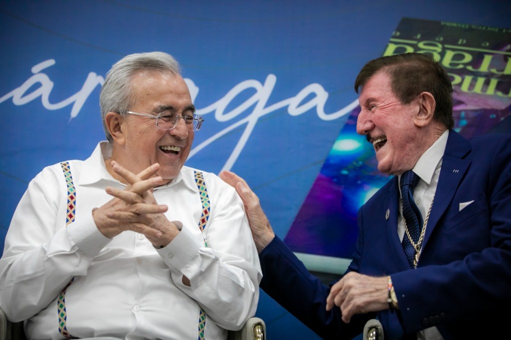 Culiacán, Sinaloa, a Junio de 2023.- Al ritmo de las espectaculares notas musicales de la banda «Estrellas de Sinaloa» que inundaron de alegría el Salón Constituyentes de Congreso del Estado, este miércoles el Gobernador Rubén Rocha Moya participó como comentarista en la presentación del libro «Germán Lizárraga, el Heredero» organizado por la LXIV Legislatura, cuyos diputados Feliciano Castro Meléndrez, Presidente de la Junta de Coordinación Política y Ricardo Madrid Pérez, Presidente de la Mesa Directiva, otorgaron una cálida bienvenida al también llamado «Rey de la Banda».