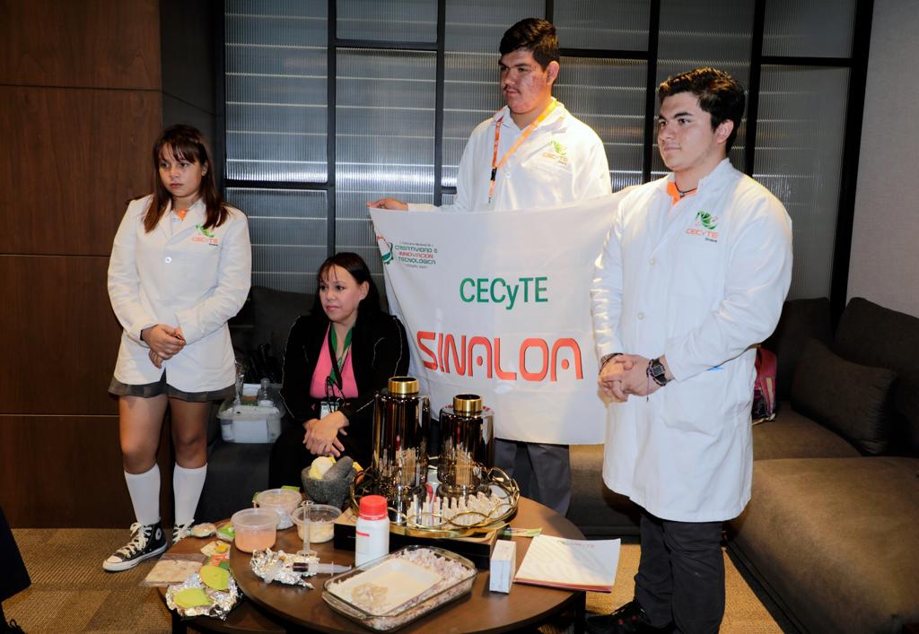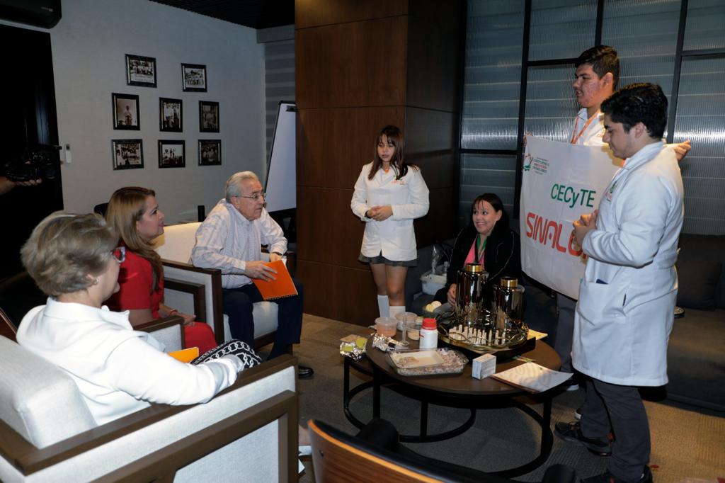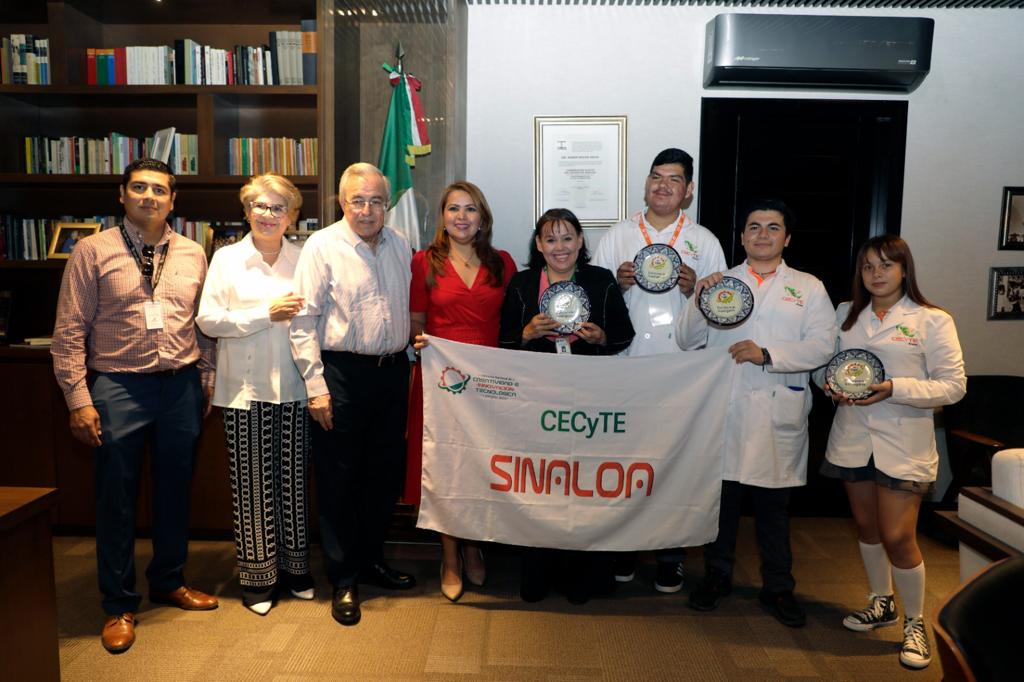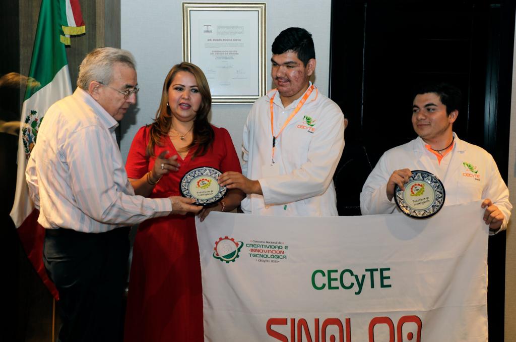 Los jóvenes galardonados fueron acompañados por la directora general del Centro de Estudios Científicos y Tecnológicos de Sinaloa (CECyTE), Emma Karina Millán Bueno, quien agradeció el gesto del gobernador Rocha de reunirse con los jóvenes Luna Getzamany Carrillo Rivera, José Manuel García Gastélum y Juan Carlos Urías Hernández, así como con su maestra Dulce María Muy Rangel.