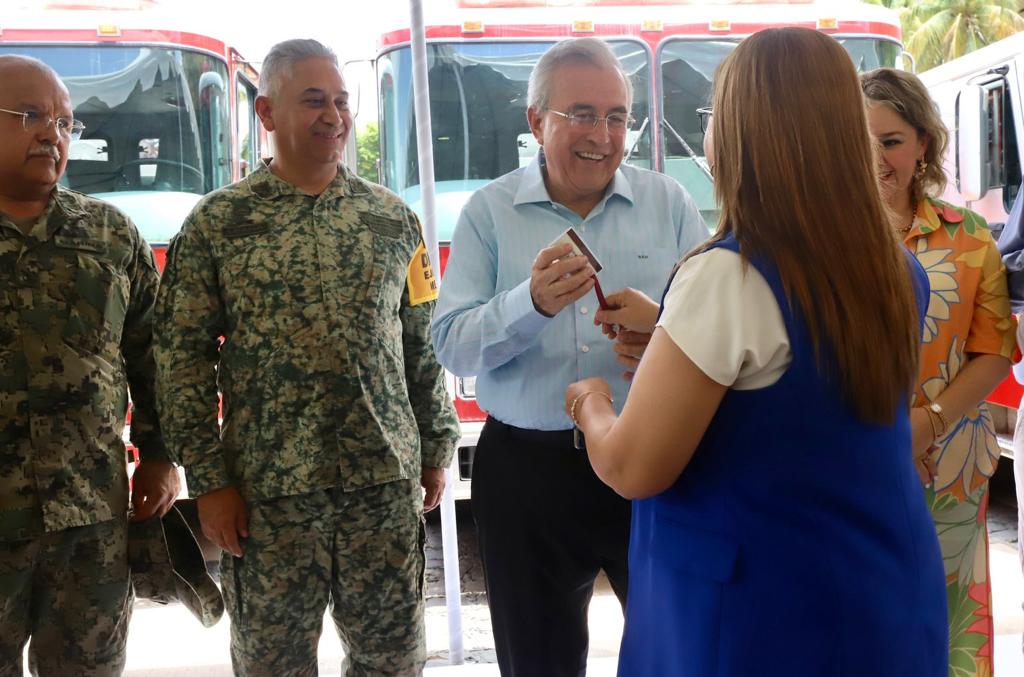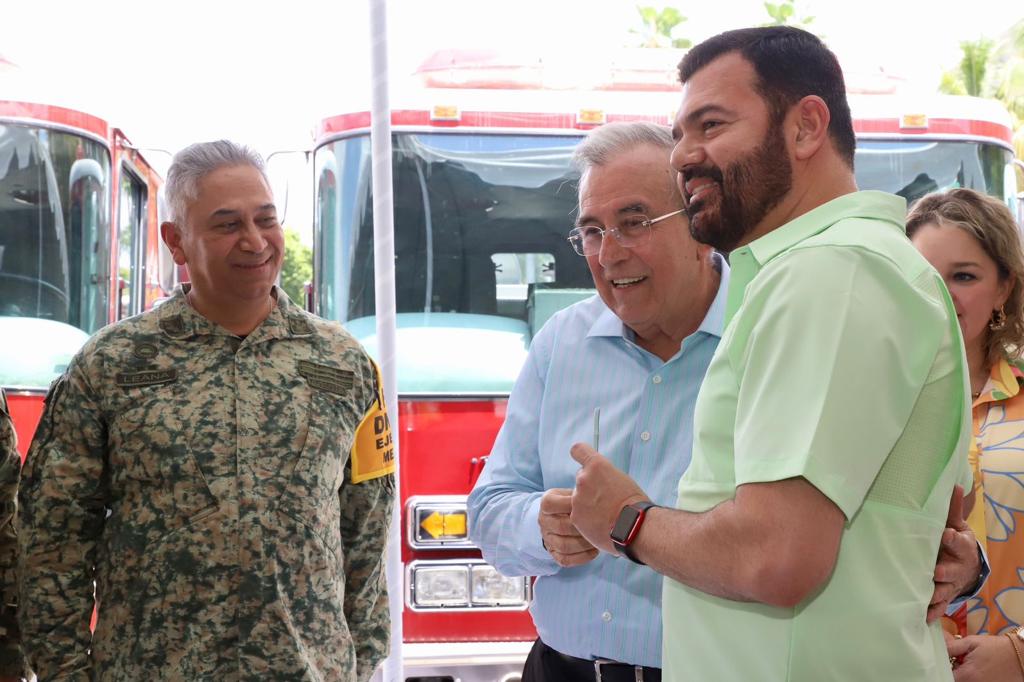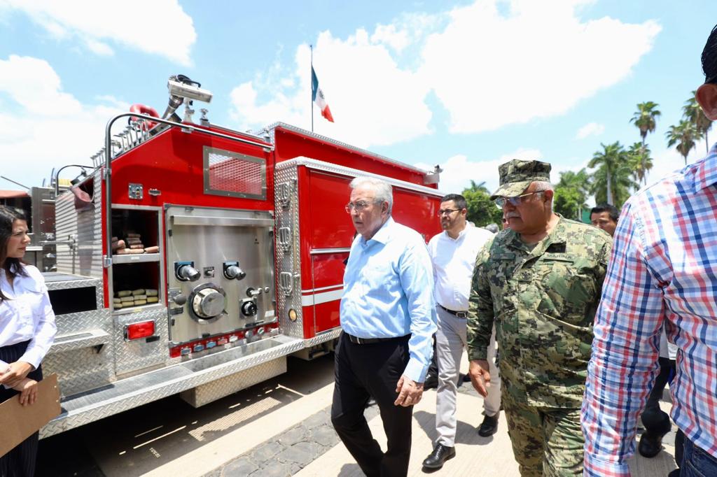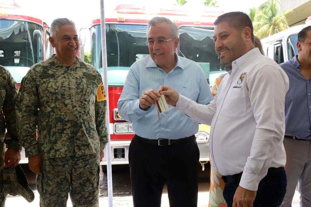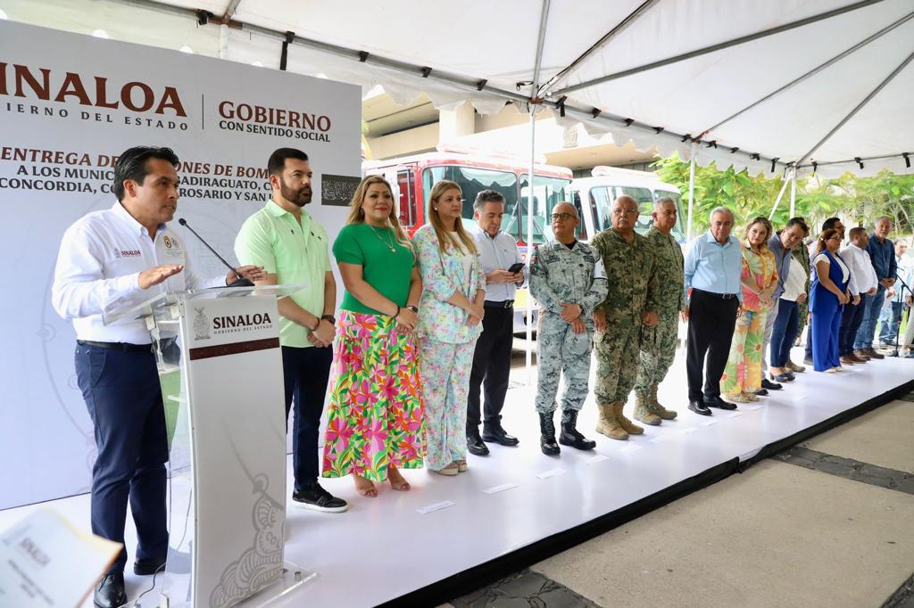 Además de la presencia de José Paz López Elenes presidente municipal de Badiraguato, Amalia Gastélum Barraza presidenta municipal de Choix, Raúl Díaz Bernal presidente municipal de Concordia, Carla Úrsula Corrales Corrales presidenta municipal de Cósala, Claudia Liliana Valdez Aguilar presidenta municipal de Rosario y Octavio Bastidas Manjarrez presidente municipal de San Ignacio, a quienes se les hizo entrega de los camiones de bomberos y el equipo de rescate.