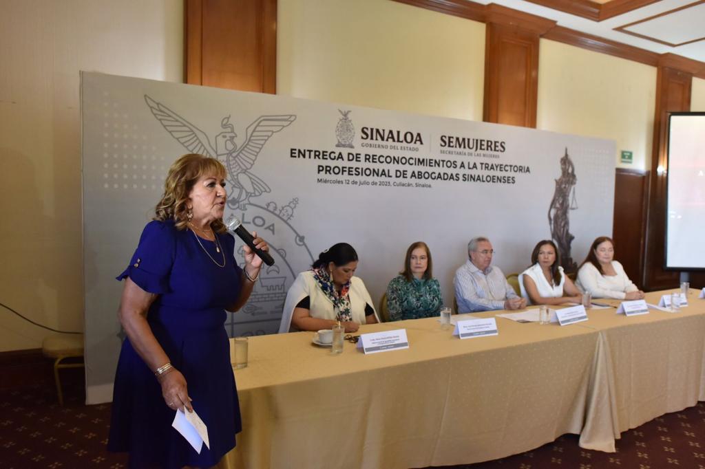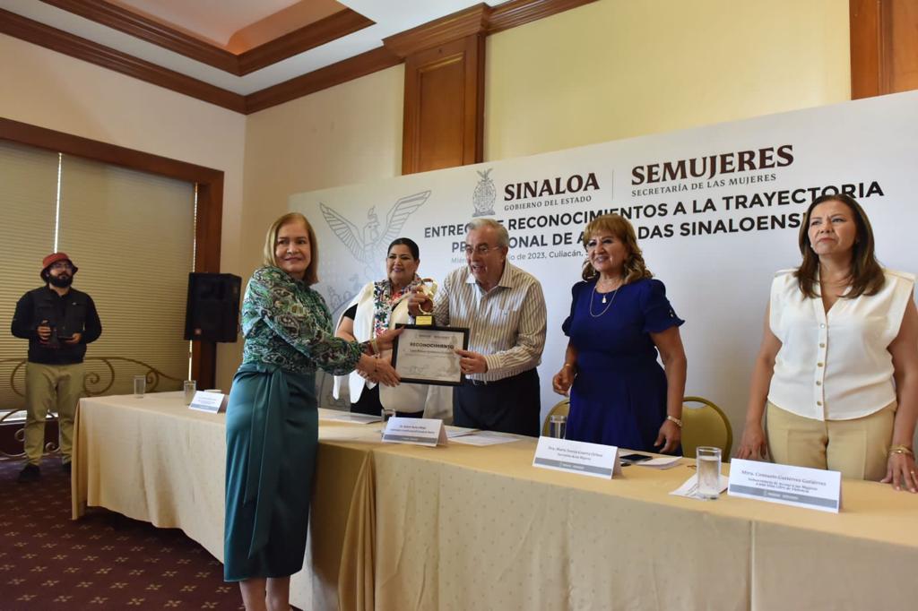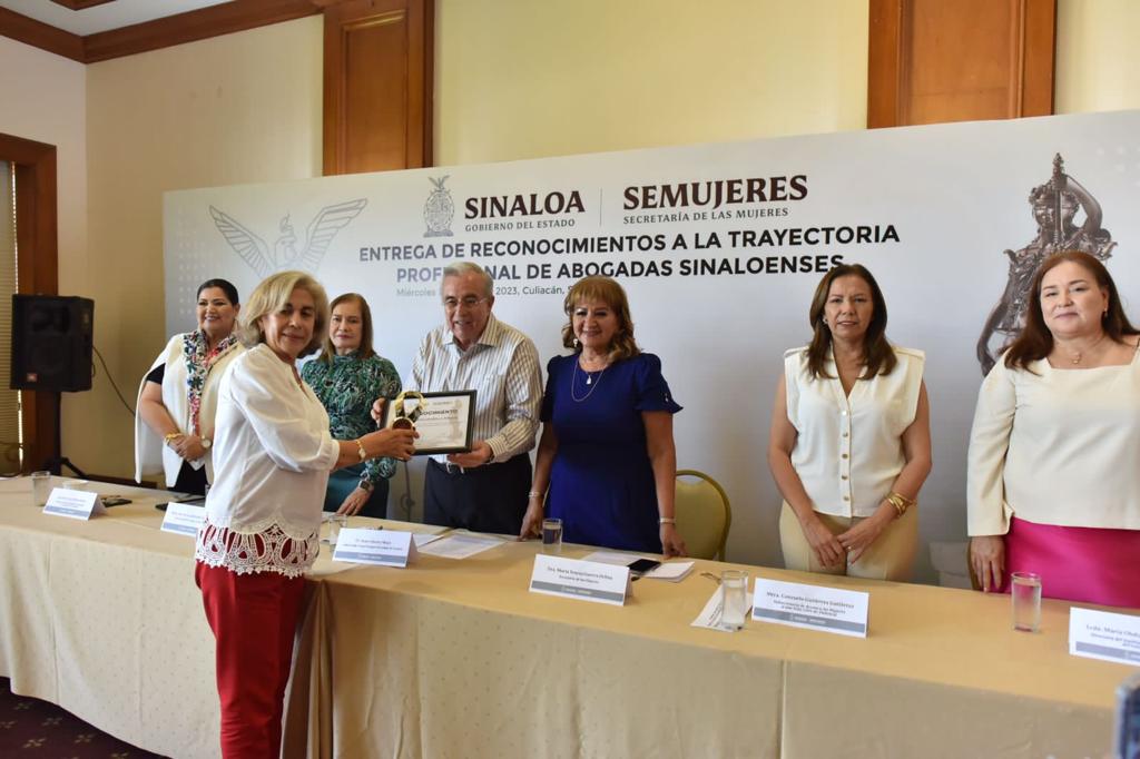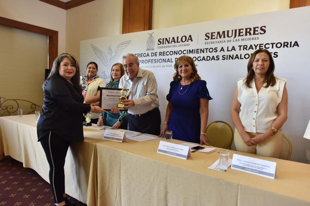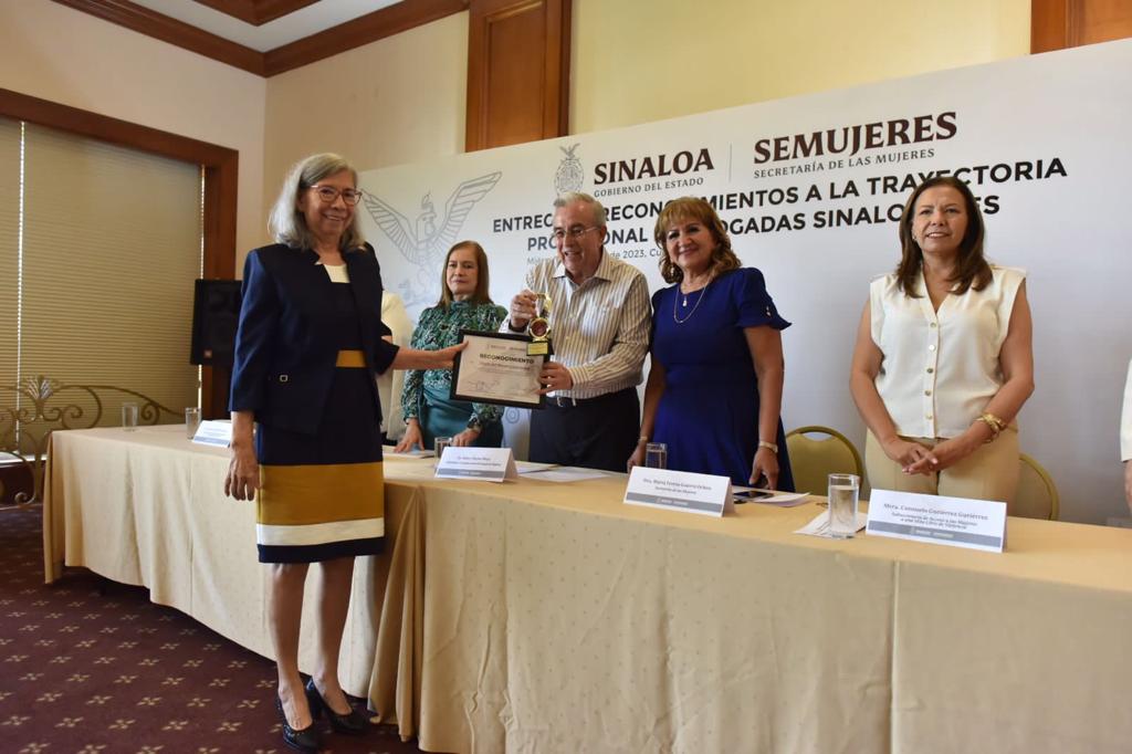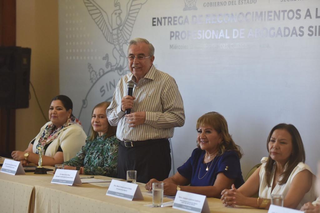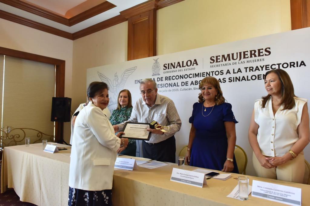 El mandatario estatal acompañó a la secretaria de las Mujeres, Tere Guerra Ochoa, a un evento donde se hicieron entrega de nueve reconocimientos a destacadas mujeres abogadas, dos de ellos póstumos, para Martha Arteaga Bravo, primera mujer magistrada del Supremo Tribunal de Justicia, y para Norma Corona Sapién, activista en favor de movimientos sociales en el estado, y quien además fue presidenta de la Comisión Estatal de Derechos Humanos de Sinaloa.