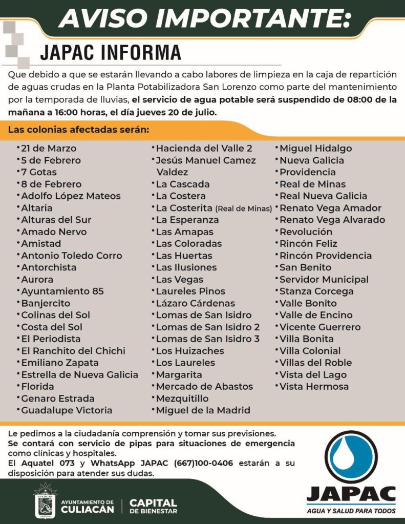 La Junta Municipal de Agua Potable y Alcantarillado de Culiacán informa que, debido a trabajos de limpieza en la infraestructura de aguas crudas en la Planta San Lorenzo, el servicio de agua potable será suspendido el próximo jueves 20 de julio en 66 colonias de la zona sur de Culiacán.