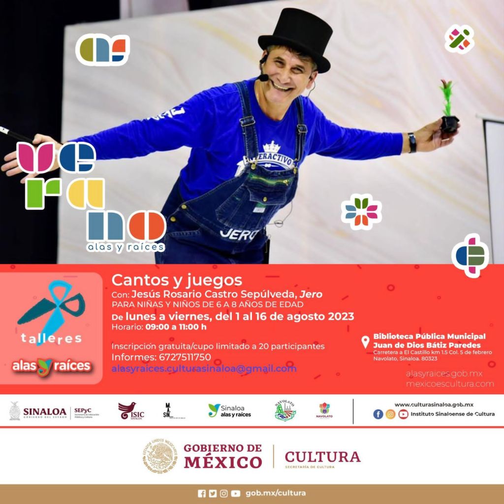 Navolato, Sinaloa, a julio de 2023.*- El H. Ayuntamiento de Navolato que encabeza la Alcaldesa Margoth Urrea Pérez, invita a las niñas y niños de 6 a 8 años de edad, al taller “Cantos y Juegos”, que llevarán a cabo la Biblioteca Pública Municipal y el Instituto Sinaloense de Cultura, a través del Programa Alas y Raíces Sinaloa, del 1 al 16 de agosto de 2023.