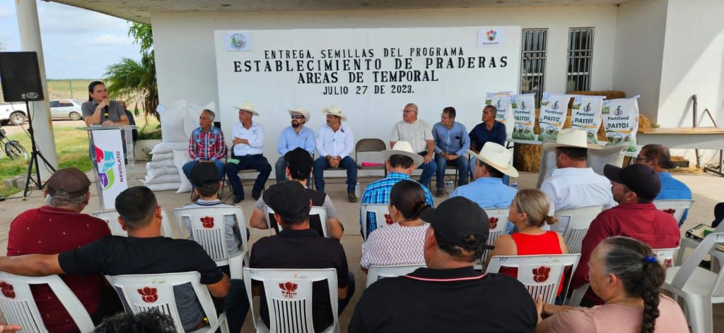 Navolato, Sinaloa, a julio de 2023.*- La Presidenta Municipal de Navolato, Margoth Urrea Pérez, junto al Subsecretario de Ganadería del Gobierno del Estado, Ing. Alfredo Valdez Zazueta, Presidente de la Unión Ganadera Regional de Sinaloa, Mario Camacho Angulo y el Presidente de la Asociación Ganadera de Navolato, Rigoberto Rivas Ayón, sostuvo un encuentro con ganaderos donde se hizo entrega de semillas del Programa Establecimiento de Praderas de Áreas de Temporal.
